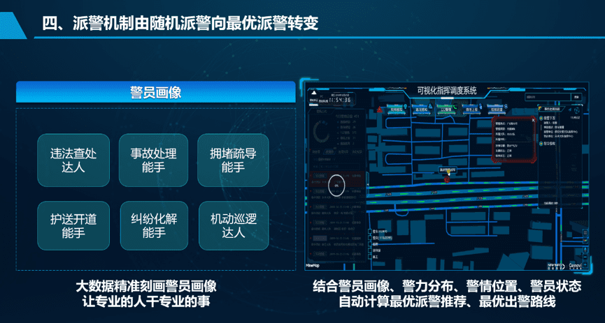 解决计划:世纪高通依托海量数据优势,,, ,,,,,运用大数据画像手艺为民警绘制警员画像,,, ,,,,,例如:通俗事故处置惩罚能手、重大事故处置惩罚能手、拥堵疏导能手等。。。。。。 。指挥中心凭证警员画像,,, ,,,,,团结警力漫衍、事务位置、警员状态等多个维度,,, ,,,,,天生最优派警模子(手艺最优、路径最优),,, ,,,,,让专业的人干专业的事。。。。。。 。