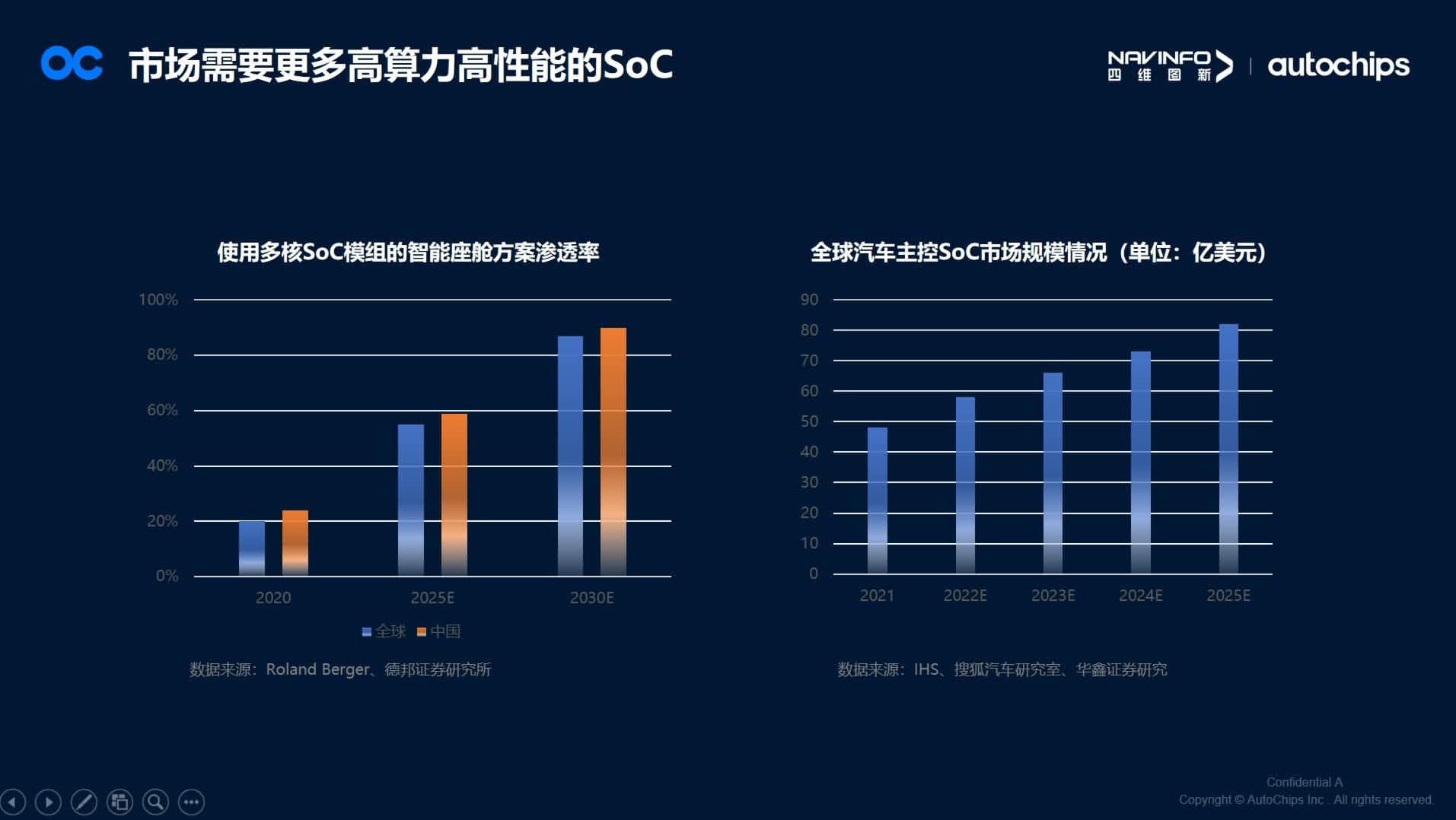 在演讲中,, , ,,,,马伟华从汽车电动化智能化浪潮引领车规SoC和MCU厘革谈起,, , ,,,,汽车EE架构厘革将导致市场需要更多高算力高性能的自动驾驶SoC和智能座舱SoC。。。 。。。 。。据IHS Markit预计,, , ,,,,2024年座舱NPU算力需求将是2021年的10倍,, , ,,,,CPU算力需求是2021年的3.5倍。。。 。。。 。。全球使用多核SoC模组的智能座舱计划渗透率将在2025年靠近60%,, , ,,,,2030年凌驾80%,, , ,,,,全球汽车主控SoC市场规模也将在2025年突破80亿美元。。。 。。。 。。由此配景下带给国产汽车芯片厂商在SoC这条蹊径上将有更长的路要走,, , ,,,,更多的事情要做。。。 。。。 。。