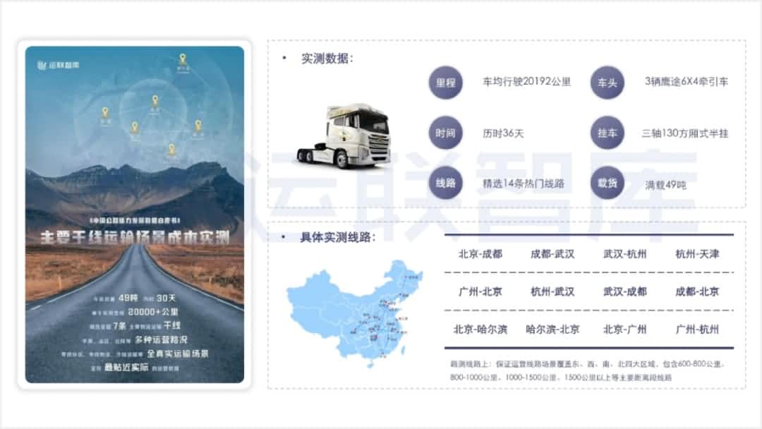 本次白皮书数据泉源分为三块。。。。。。。其一是宏观大数据,,,,,,,,主要来自:国家统计局、交通部、中寰卫星等平台;;;;;其二是实测的线路数据,,,,,,,,由本次路测方一汽解放测试并提供,,,,,,,,并团结中寰卫星车联网大数据举行验证;;;;;其三是车队调研数据,,,,,,,,由运联研究院针对多条线路车队,,,,,,,,举行实地走访完成网络。。。。。。。运联通过其专业的研究能力、普遍的资源链接、实地的一线走访,,,,,,,,把获得的精准真实的运营数据,,,,,,,,还原到基础的逻辑层面,,,,,,,,形成客观的、系统性的、对行业有价值的剖析与判断。。。。。。。