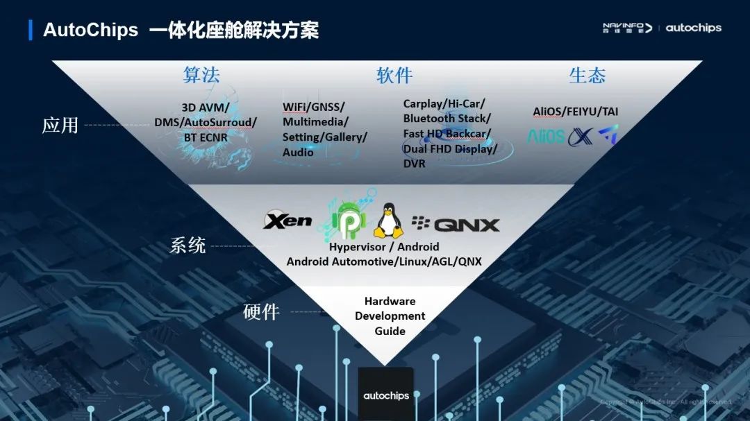 打造智能座舱一体化解决计划,,,,,,杰发科技涵盖了应用、系统和硬件三个方面。。。。。。。。应用端,,,,,,提供配套算法,,,,,,支持手机互联、Carplay等软件,,,,,,并可以与AliOS、FEIYU等生态适配;;;;;;;系统端适配包括Android、Linux等操作系统;;;;;;;硬件层,,,,,,只需在应用层做一定开发,,,,,,就能抵达较量稳固的状态。。。。。。。。马伟华比喻到,,,,,,在智能座舱越来越重大的今天,,,,,,一体化解决计划就相当于一套精装房,,,,,,可以实现拎包入住,,,,,,这不但大大节约了客户及开发者的软件投入和开发时间,,,,,,还能获得便捷、稳固的底层系统依托。。。。。。。。