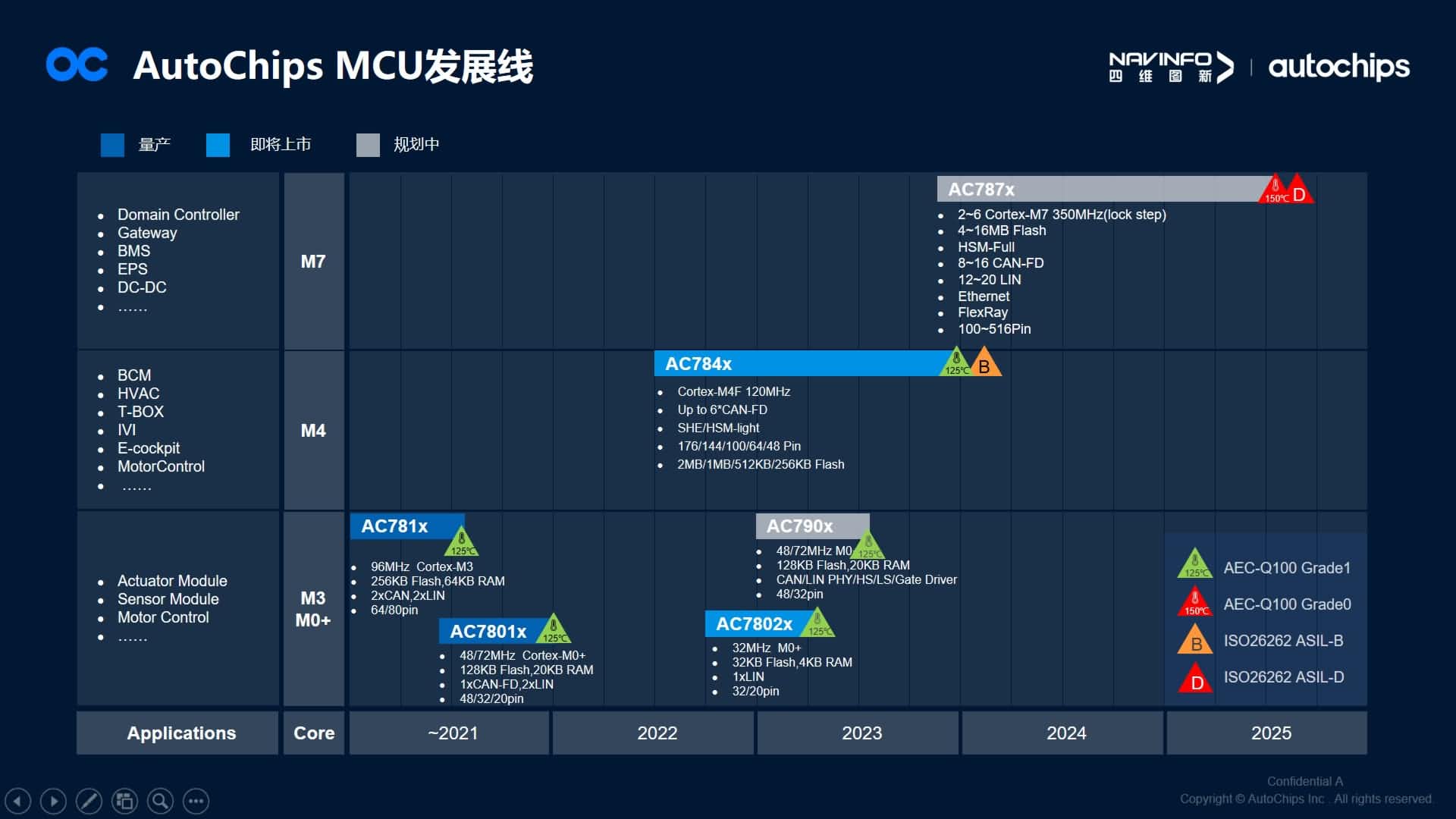 马伟华还在现场分享了AutoChips首颗知足功效清静要求的MCU AC7840x,, , ,,,,AC7840x系列是AutoChips首款基于ARM Cortex-M4F 内核的车规级MCU,, , ,,,,切合ISO 26262功效清静ASIL-B,, , ,,,,支持AUTOSAR 4.4,, , ,,,,提供MCAL及设置工具,, , ,,,,并且拥有更大的Flash与更多的引脚。。。 。。。 。。AC7840x的应用将越发普遍,, , ,,,,尤其突破了对清静性、可靠性要求更高的底盘域和动力域应用。。。 。。。 。。现在,, , ,,,,AC7840x已经陆续送样,, , ,,,,其中有客户已进入产品验证阶段。。。 。。。 。。