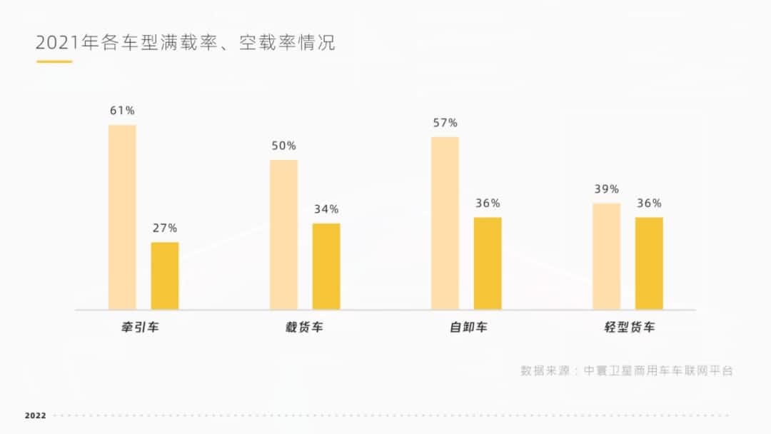 白皮书还通过天下运力平均吨位的上涨反应出车效提升。。。。。。。据中寰卫星车联网大数据显示,,,,,,,,2021年,,,,,,,,各车型满载率情形划分为:牵引车60.72%、载货车49.58%、自卸车56.76%、轻型货车39.29%,,,,,,,,整体略微提升。。。。。。。